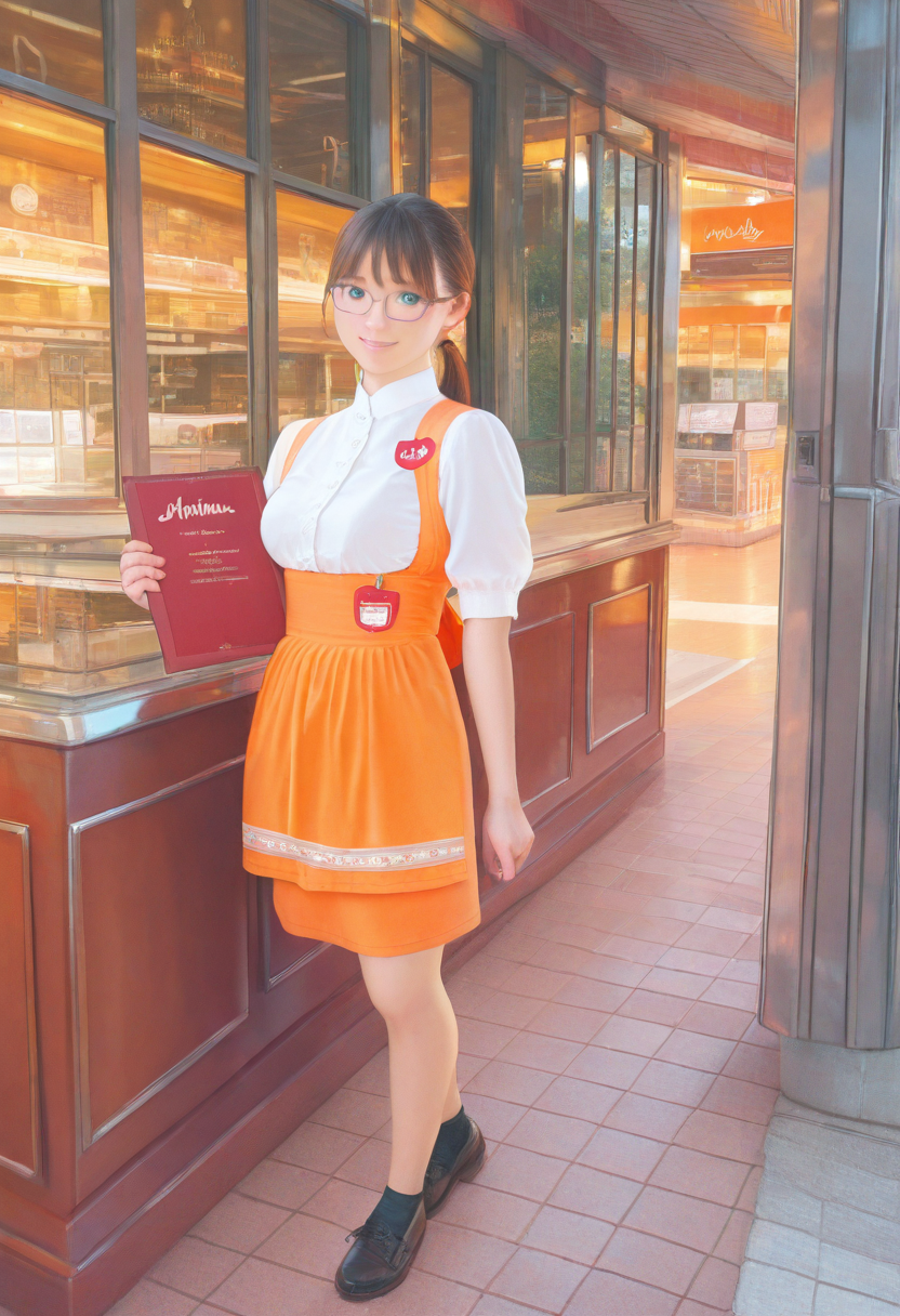 AMSC, waitress, 1girl, indoors, solo, restaurant, black hair, window, holding, menu, uniform, standing, orange skirt, orange apron, full body, short sleeves, wooden table,