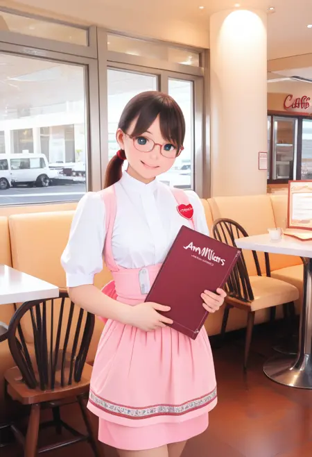 AMSC, waitress, 1girl, indoors, solo, restaurant, black hair, window, holding, menu, uniform, standing, pink apron, pink skirt, ponytail, full body, short sleeves, wooden table,