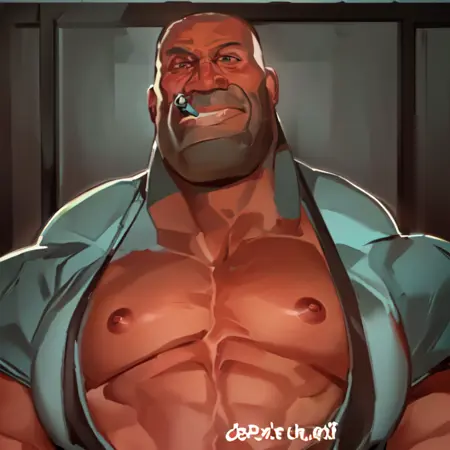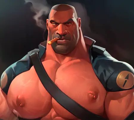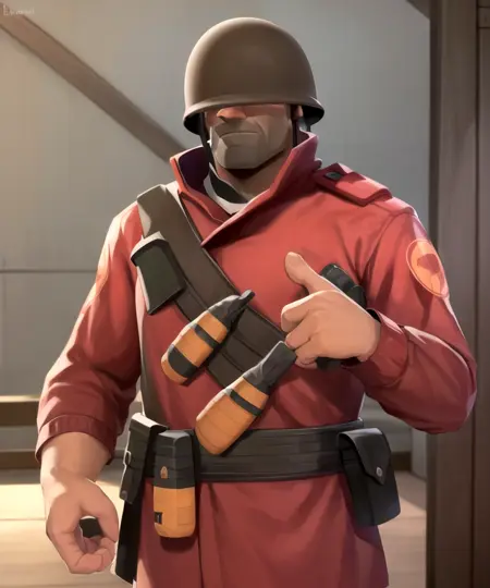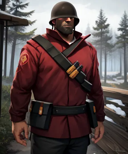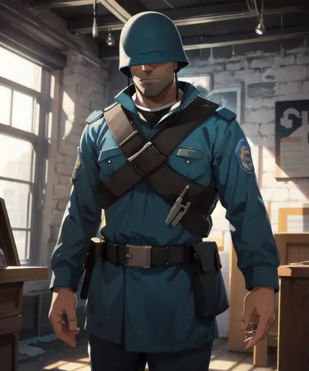 helmet, red/blue jacket, bandolier, two grenades, covered eyes, on prompts can help