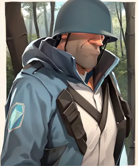helmet, red/blue jacket, bandolier, two grenades, covered eyes, on prompts can help