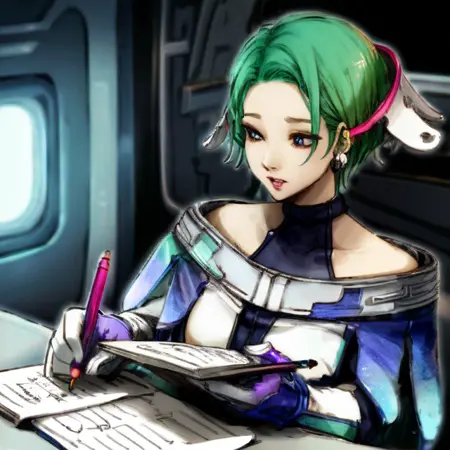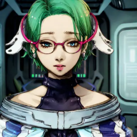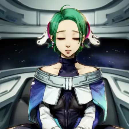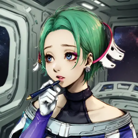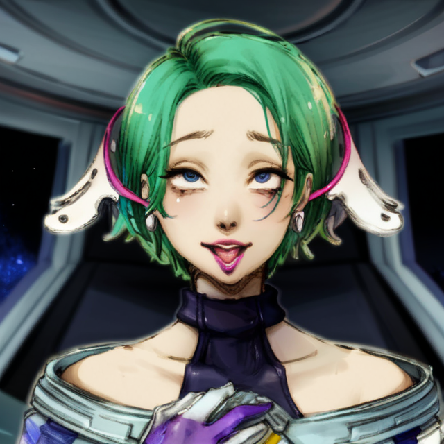 추천 프롬프트: stella, 짧은 머리, 녹색 머리, 보석, 귀걸이, 파란 눈, 드러난 어깨, 장갑, 우주복, 목뼈, 머리 장식, 메이크업, 터틀넥, 눈 밑 두더지