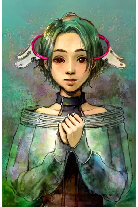 Suggested prompt: stella, short hair, green hair, jewelry, earrings, blue eyes, bare shoulders, gloves, space suit, collarbone, hair ornament, makeup, turtleneck, mole under eye