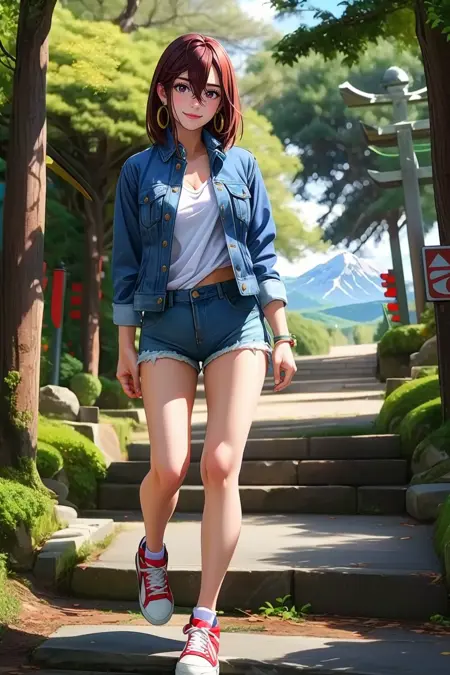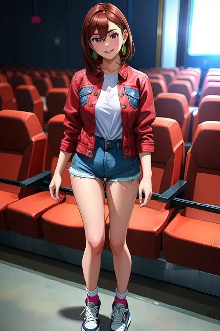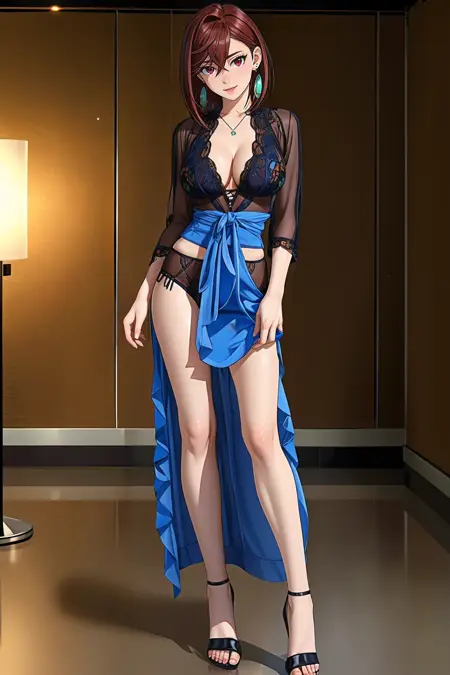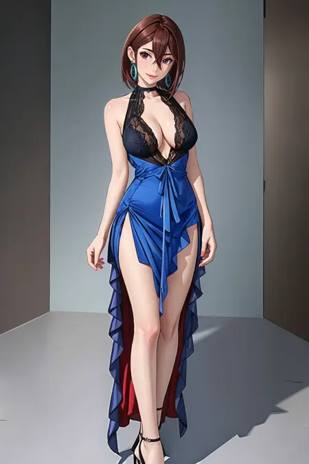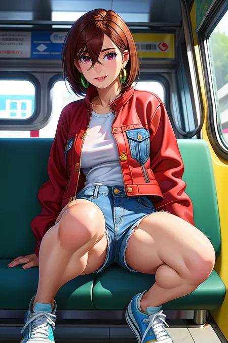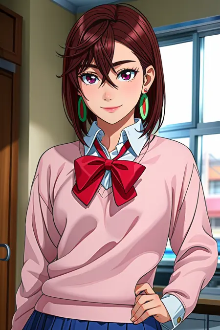 momo ayase,1girl,brown hair,short hair,hair between eyes,red eyes,earrings,medium breasts