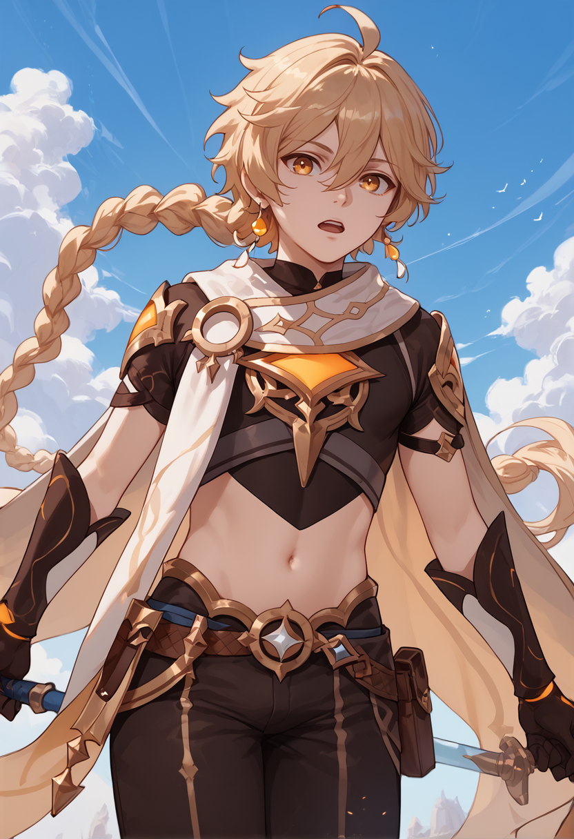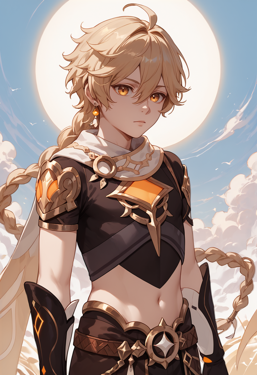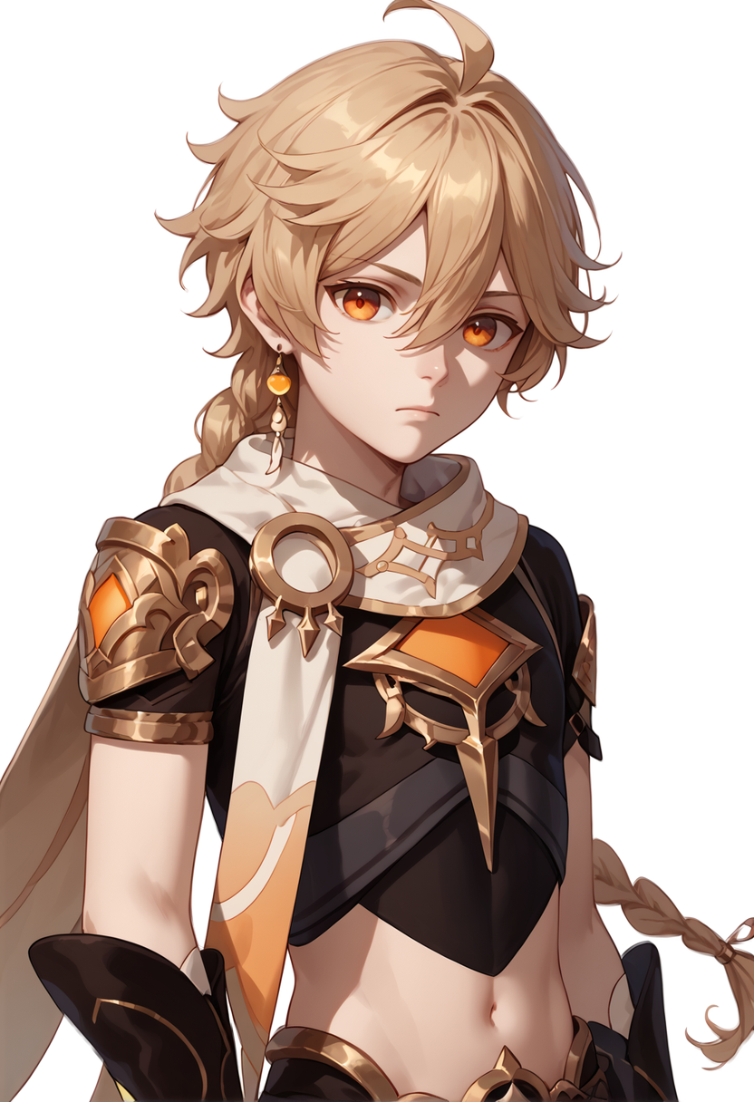 aether, 1boy, hair between eyes, braid, midriff, short sleeves, black gloves, single braid, cape, black pants, looking at viewer,