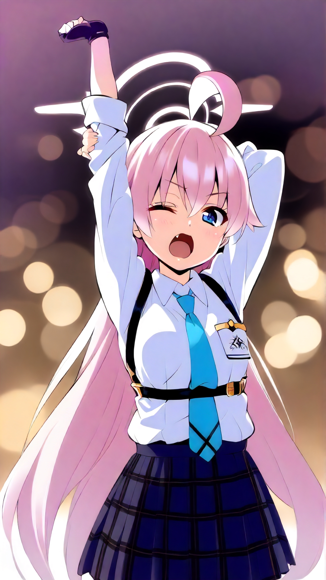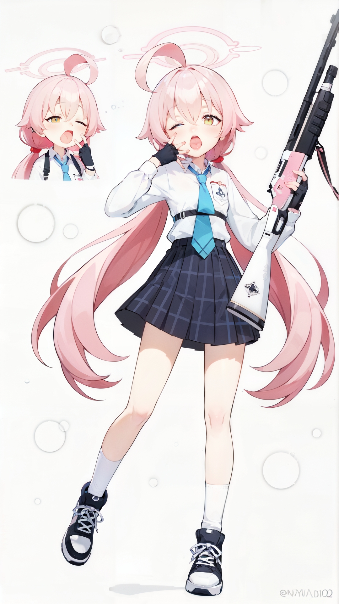 例のプロンプト: "hoshino_blue_archive, an anime girl, hoshino_blue_archive, an anime girl, 1girl, solo, long hair, open mouth, skirt, simple background, shirt, gloves, white background, school uniform, full body, yellow eyes, weapon, pink hair, ahoge, one eye closed, necktie, shoes, socks, fingerless gloves, gun, halo, sneakers, blue necktie, yawning, shotgun"