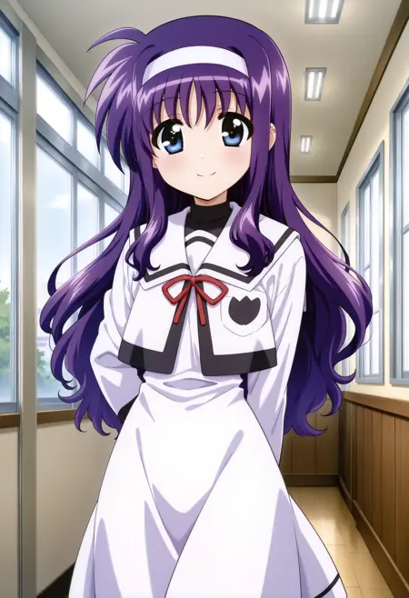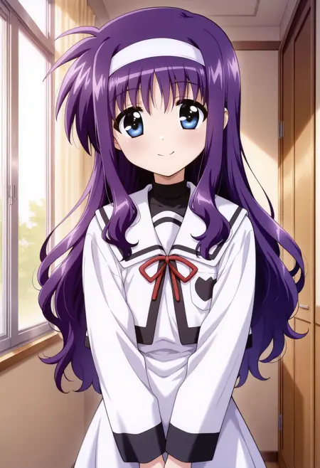 masterpiece, newest, absurdres, highres, 1girl, c-tsukimura, long hair, purple hair, blue eyes, white hairband, white dress, red neck ribbon, sailor collar, long sleeves, cowboy shot, indoors, looking at viewer, smile,