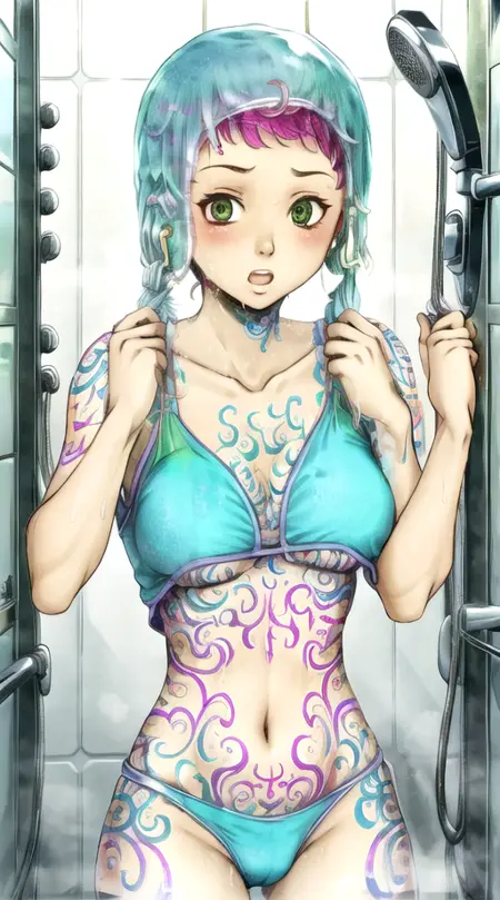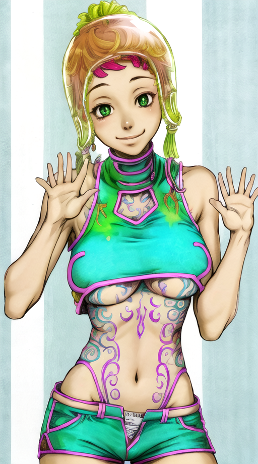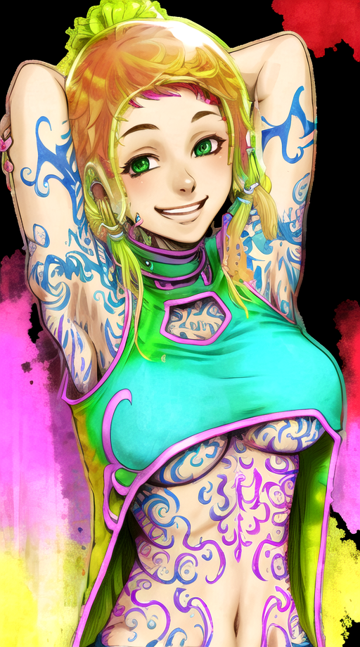 推奨プロンプト: comet, green eyes, pink hair, tattoo, short hair, , jewelry, earrings, underboob, grin, navel, midriff,, blonde hair, closed eyes, smile, blush, solo