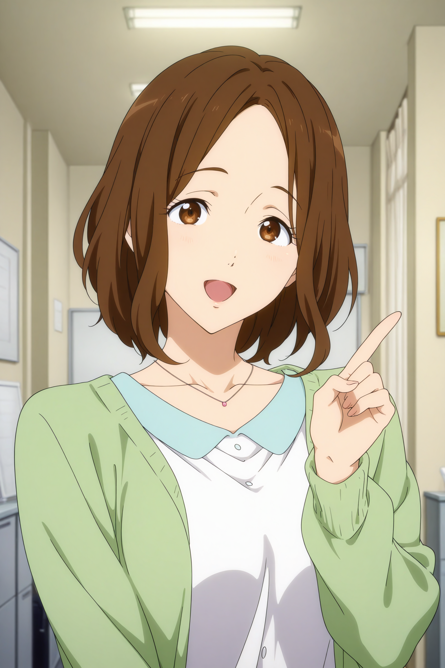 amakata miho, medium hair, parted bangs, brown hair, brown eyes, necklace, long sleeves, white shirt, green shirt, green cardigan, open cardigan, blue pants, white footwear, flats