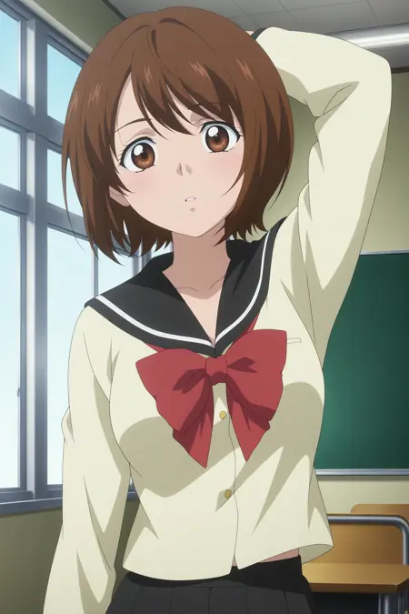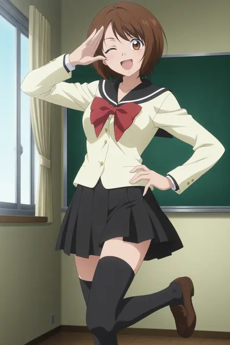 taniyama mai, short hair, brown hair, swept bangs, brown eyes, serafuku, long sleeves, yellow shirt, black sailor collar, red bow, black skirt, pleated skirt, black thighhighs, zettai ryouiki, loafers