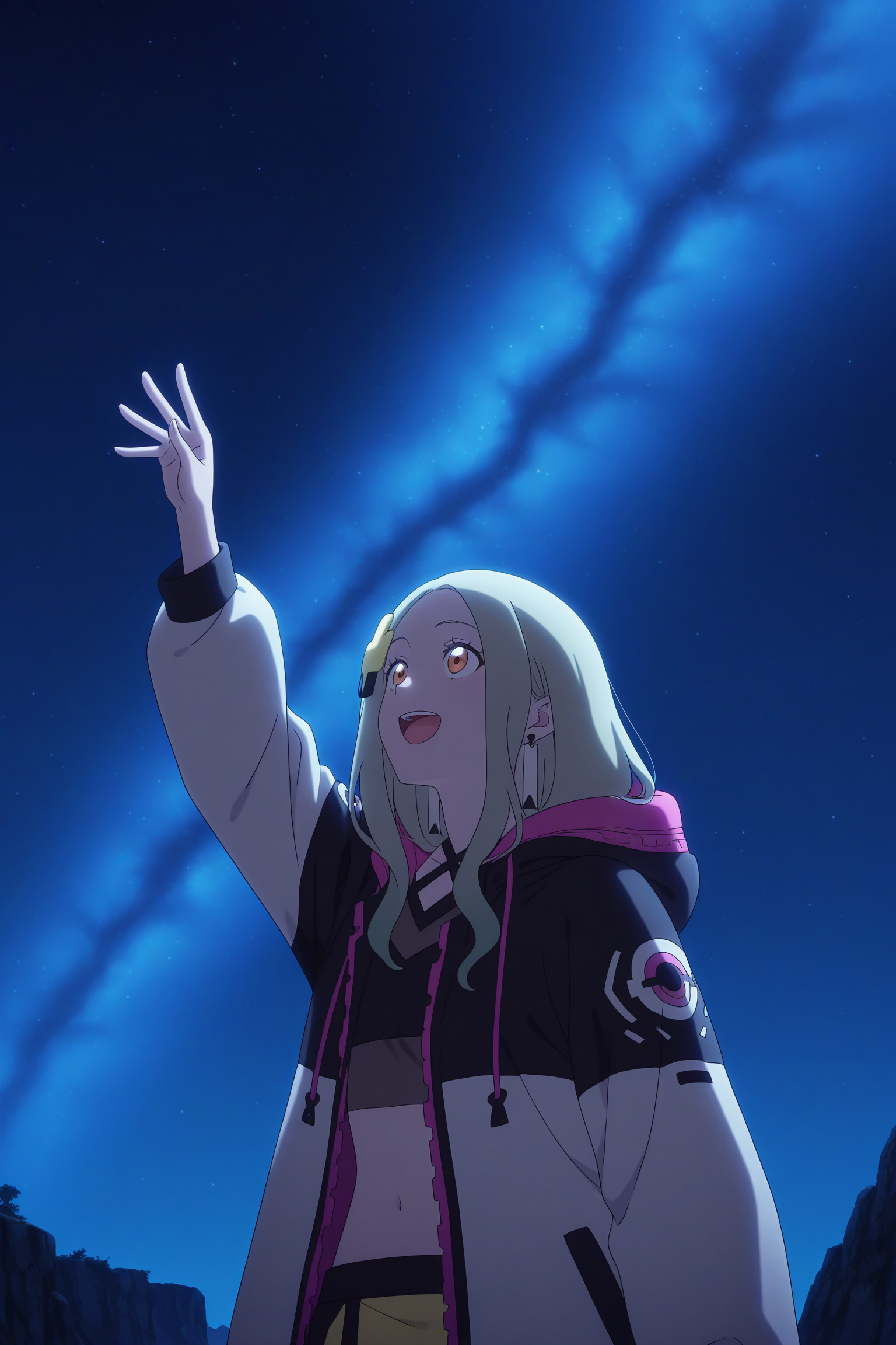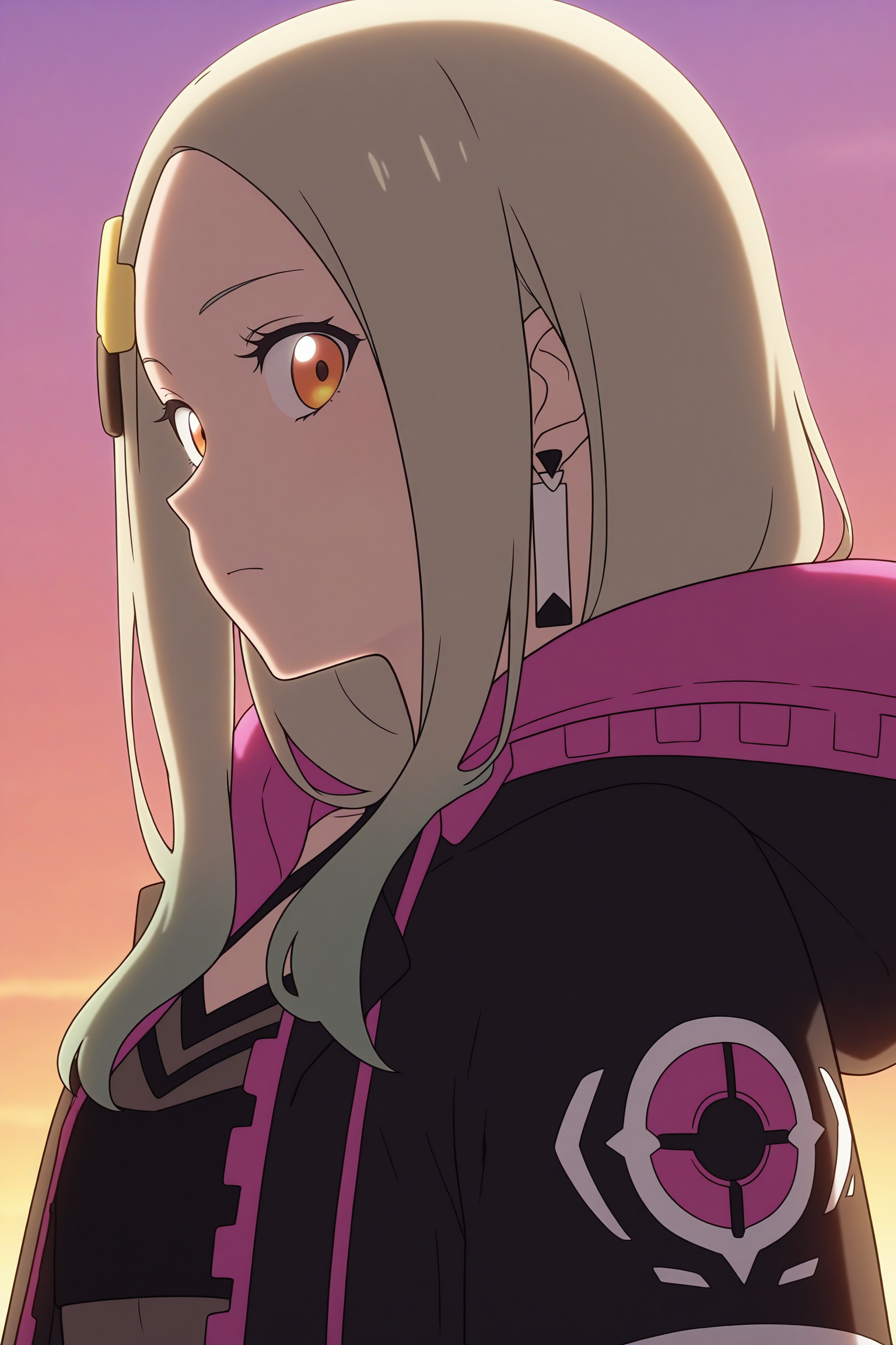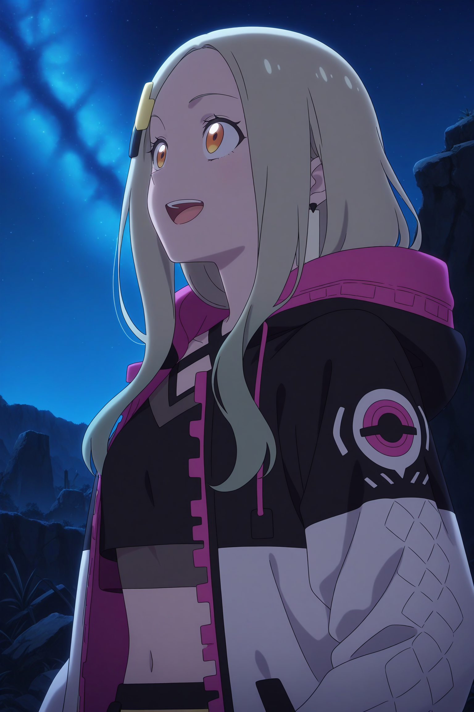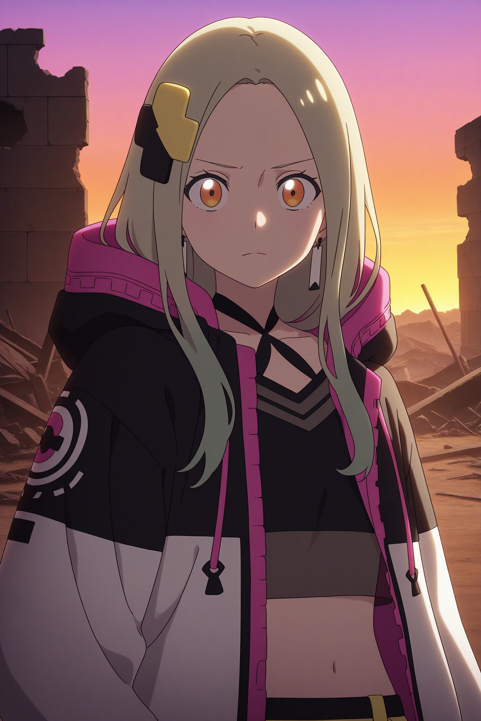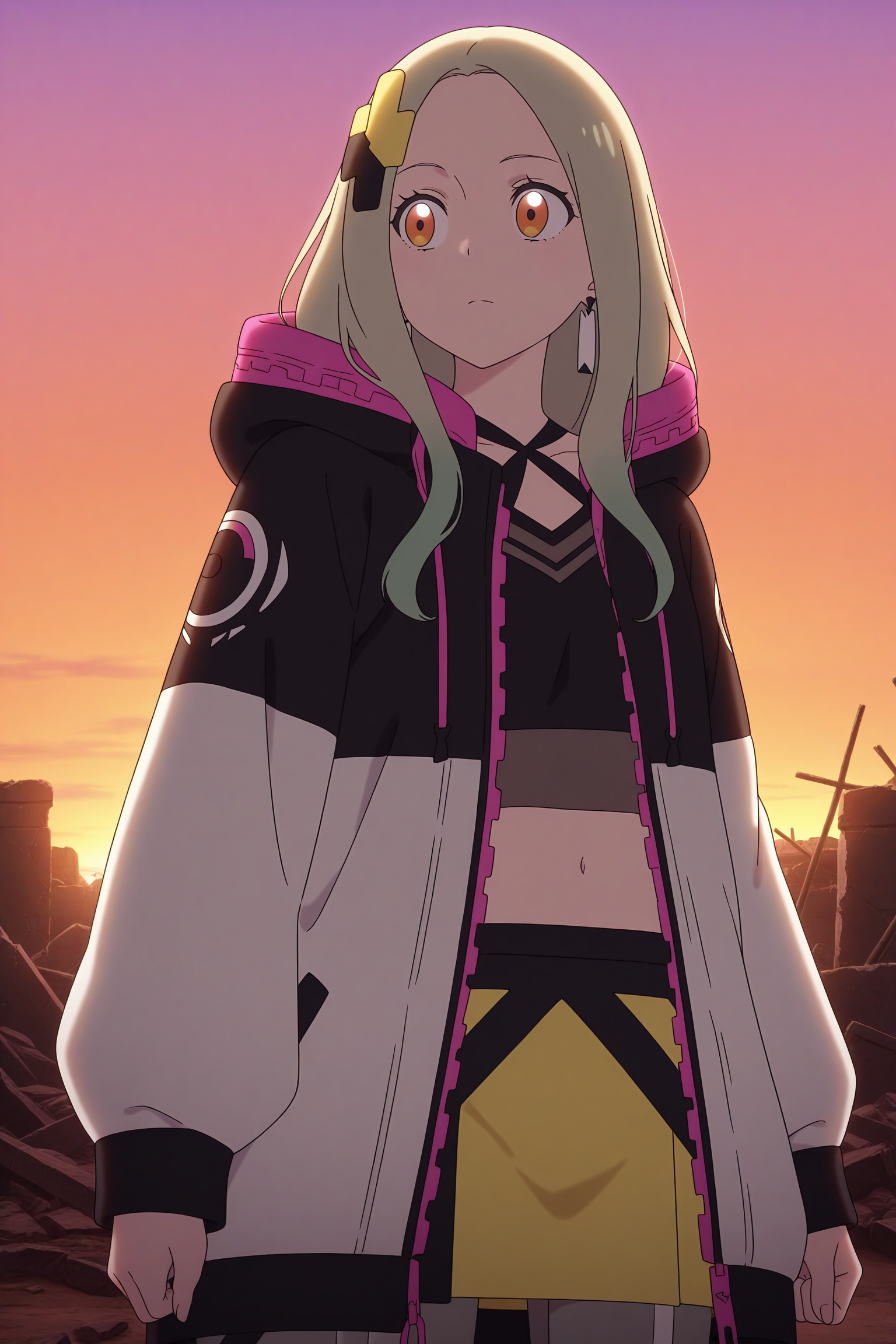 poppy (the missing 8), long hair, green hair, hair ornament, orange eyes, earrings, long sleeves, jacket, hooded jacket, open jacket, crop top, see-through, navel, yellow skirt, half-skirt, grey pantyhose, sneakers