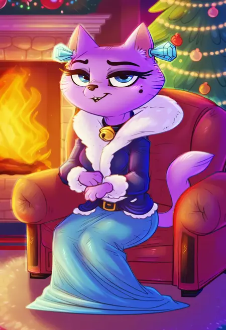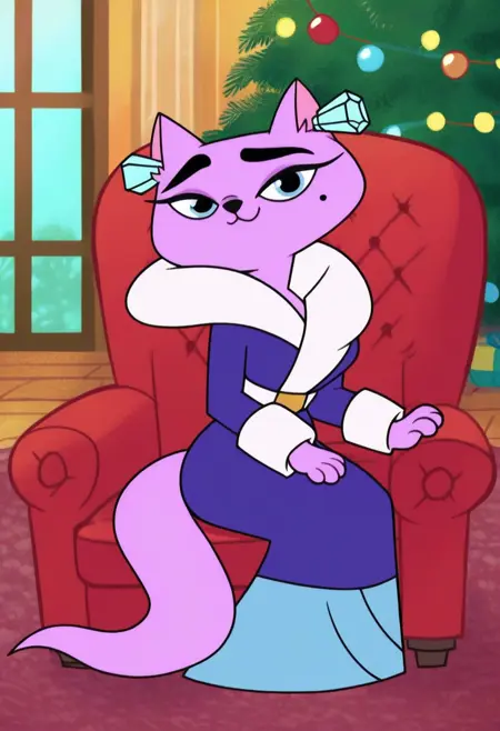Main prompts: lady catterly, cat girl, cat ears, cat tail, blue eyes, mole under eye, bright purple fur