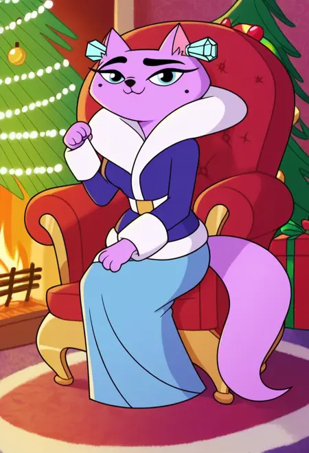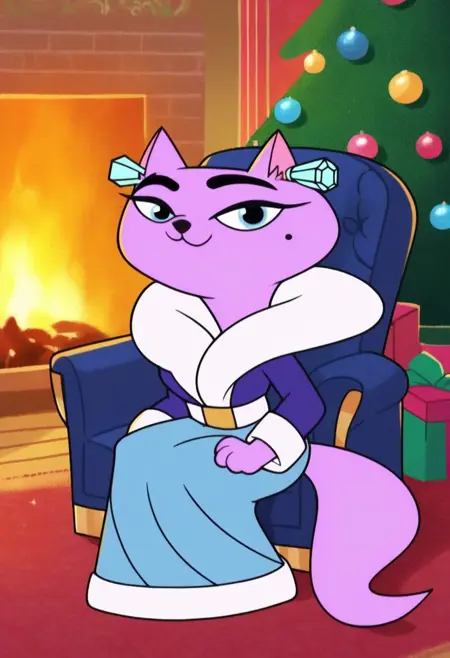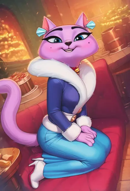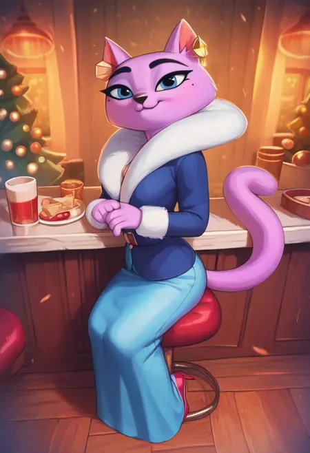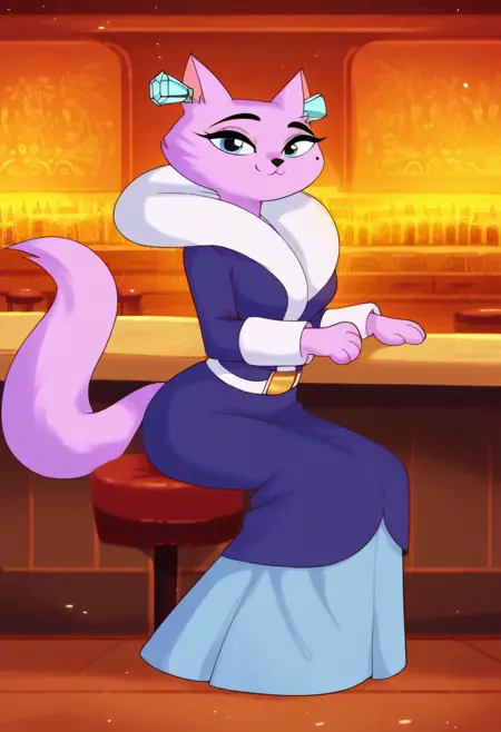 lady catterly, cat girl, cat ears, cat tail, blue eyes, mole under eye, bright purple fur