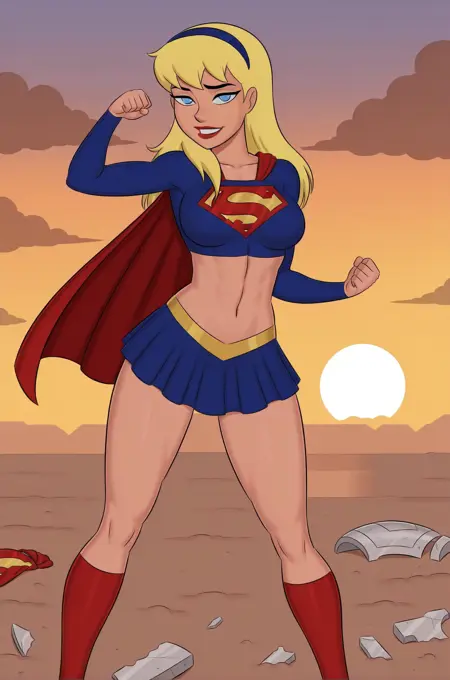 supergirl, 1girl, long hair, blonde hair, blue eyes, medium breasts, lipstick, shirt, blue shirt, long sleeves, logo, cape, red cape, miniskirt, red miniskirt, hairband, black hairband, boots, red boots, navel, midriff, solo, pose, standing, looking at viewer, white background, simple background, western comics (style), masterpiece, best quality, amazing quality