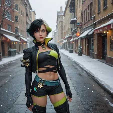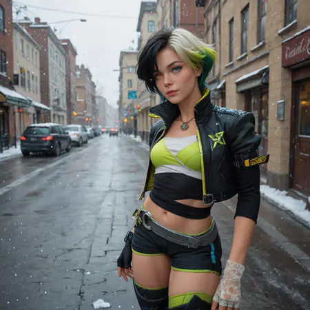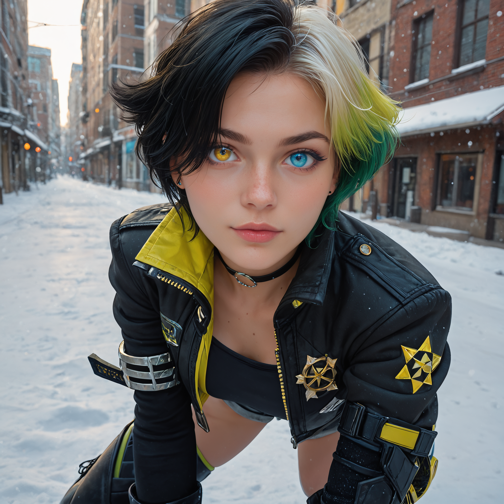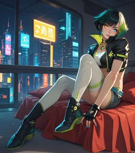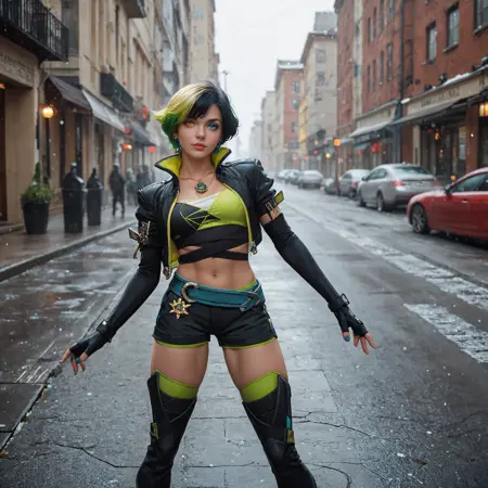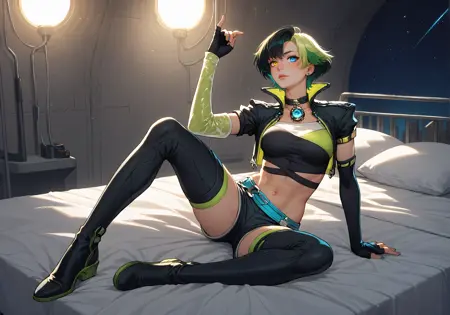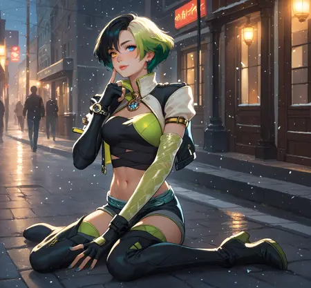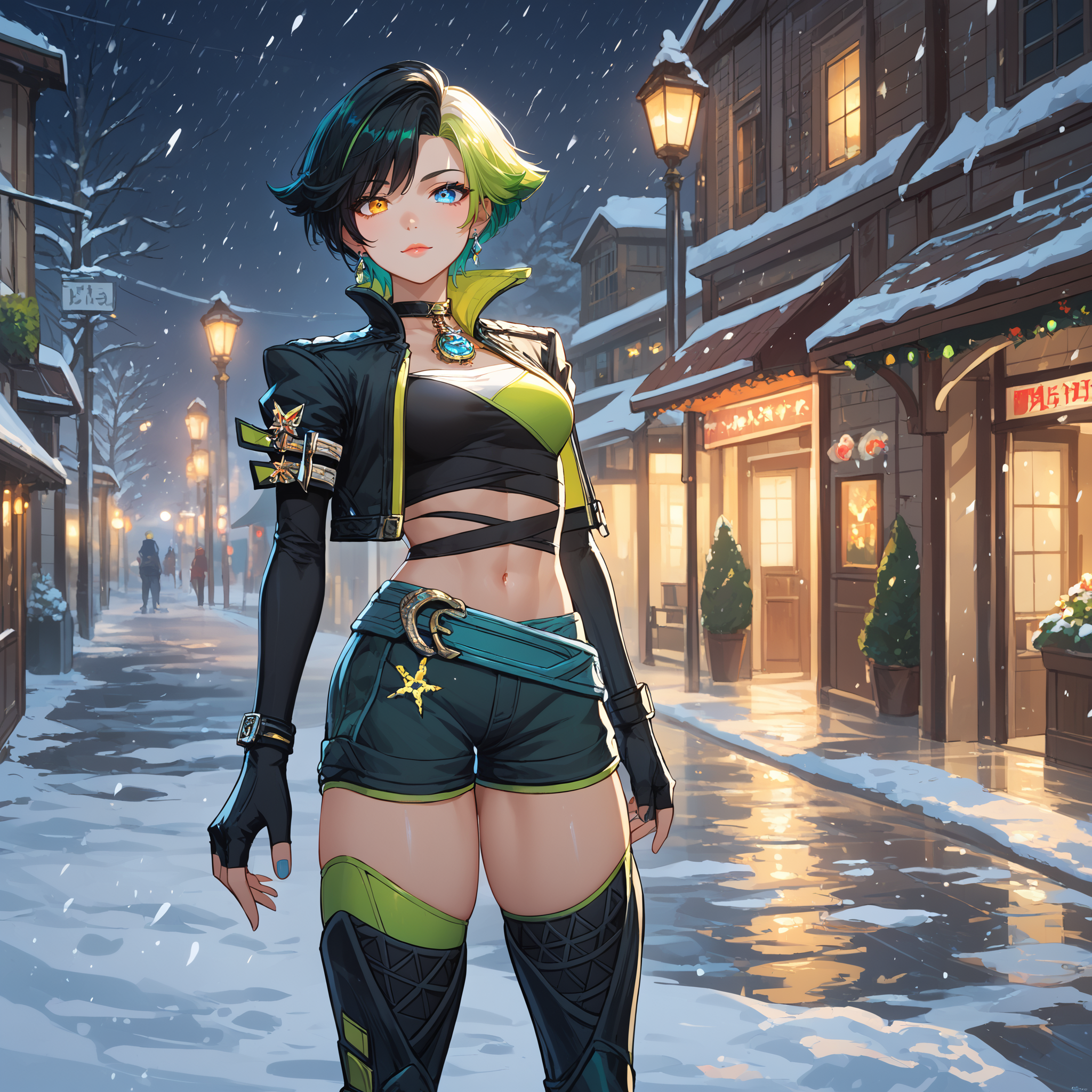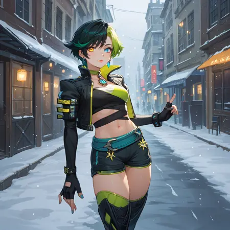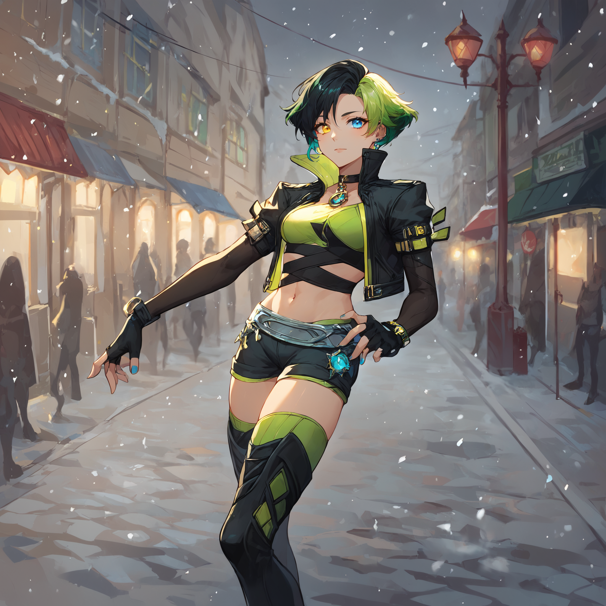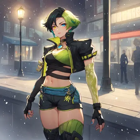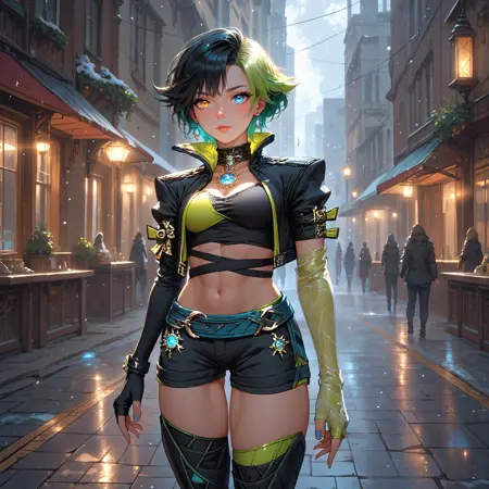 LUN4MB, 異色瞳, 1girl, シングル, 短髪, ジャケット, ショートパンツ, グローブ, 緑髪, シアハイソックス, 多色髪, 黒髪, 黄色い目, 青い目, 腹部, フィンガーレスグローブ, 短めのジャケット, ブーツ, へそ, 太ももブーツ, 黒い靴