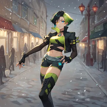 LUN4MB, 异色瞳, 1个女孩, 单人, 短发, 夹克, 短裤, 手套, 绿发, 过膝袜, 多色头发, 黑发, 黄眼, 蓝眼, 露脐, 无指手套, 短款夹克, 靴子, 肚脐, 大腿靴, 黑色鞋履