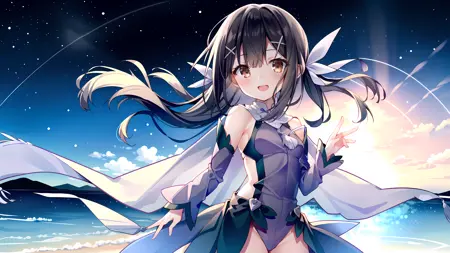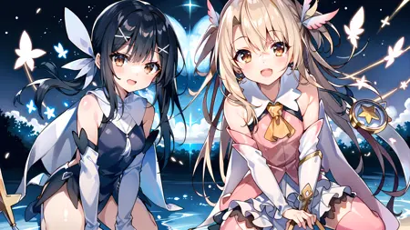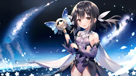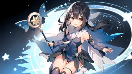 lora:美游:0.75((masterpiece:1.4, best quality)),(miyu:1.2),1girl,brown eyes,(loli:1.4),wand,(magic girl),(magic),(magic circle),outdoor,(cloud),night,sky,star,starry sky,depth of field,wind,cowboy shot,(star \(symbol\)),(happy),standing,open mouth