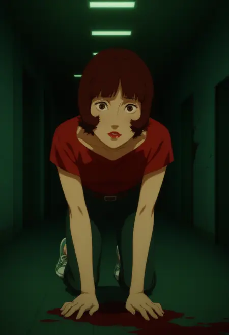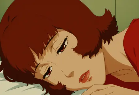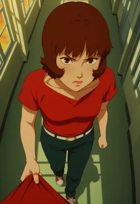 DreamAtsukoChiba,,short hair,brown hair, brown eyes,lips,lipstick,freckles,shirt,red shirt,pants,belt,