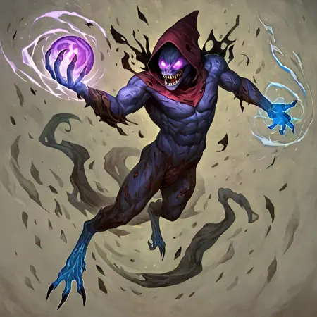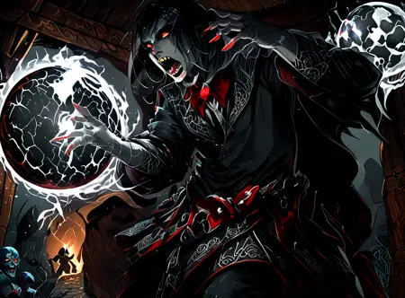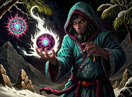 wizard - witch - hood - robe - wand - holding_wand - colored_shadow - open_hand - reaching_towards_viewer - object_floating_above_hand - cupping_hands - reaching - outstretched_arms - outstretched_hand - fighting_stance - fireball - pyrokinesis - electrokinesis - attack_trail - portal_(object) - monster_boy - monster_girl - demon_girl