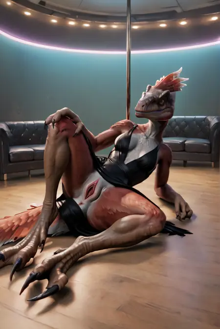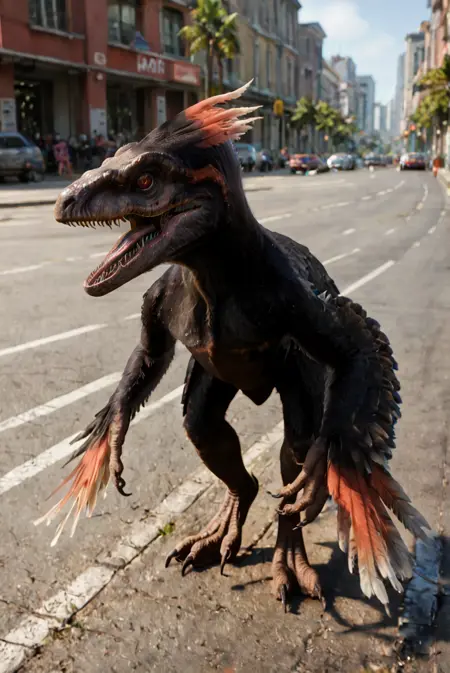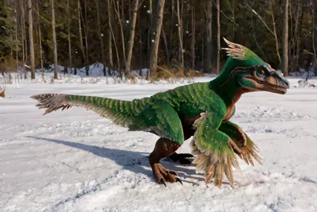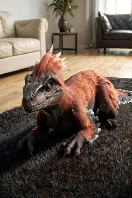 附加提示词:恐龙、鳞片、羽毛手臂、多彩羽毛