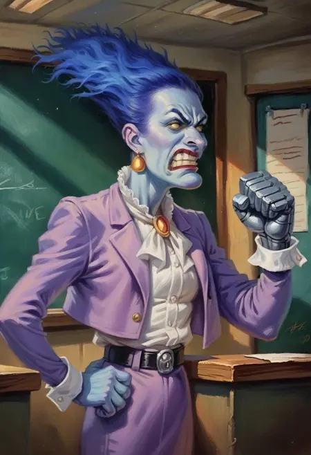 《Gravedale High》(1990年短暂播出的动画系列)中,这所怪物学校的校长,以铁腕著称,主要因由里克·莫拉尼斯饰演主角而为人所知。训练素材来自我所能找到的最高质量视频的屏幕截图,但画质并不理想。