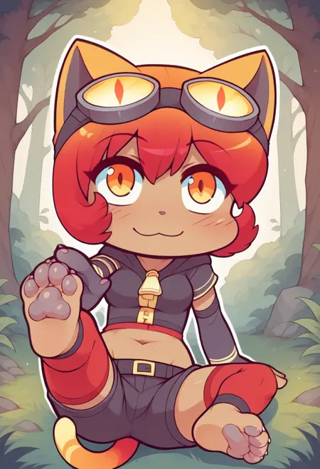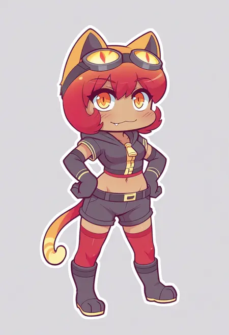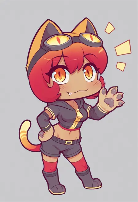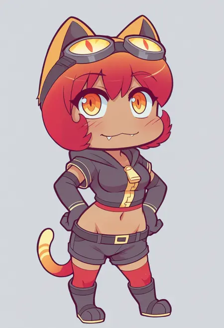 기본 프롬프트: 1girl, boopies, red hair, short hair, orange eyes, cat ears, dark skin, goggles on head, cat ears, cat tail