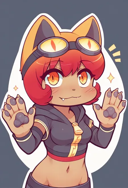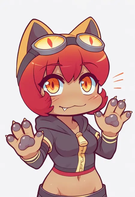 基本プロンプト:1girl,boopies,red hair,short hair,orange eyes,cat ears,dark skin,goggles on head,cat ears,cat tail