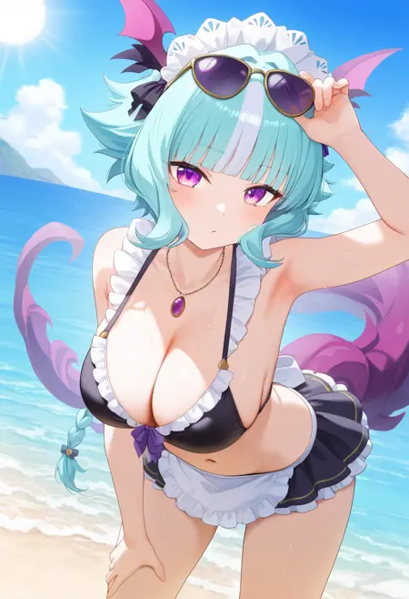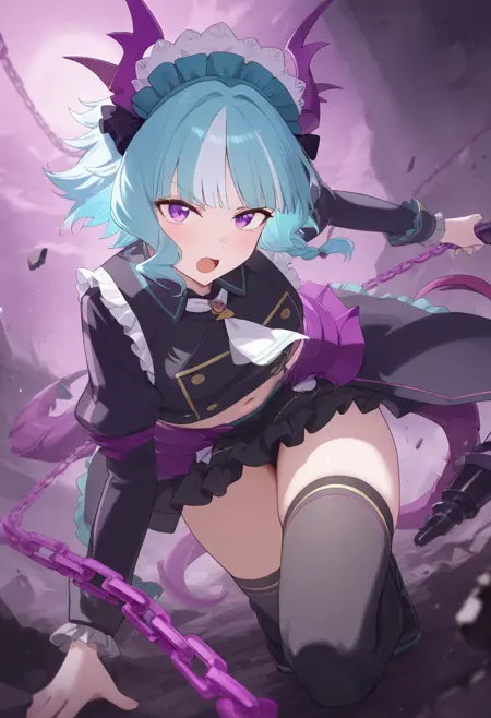 左右で異なる腕の装飾品、指なしグローブ、麒麟の尾のいずれもAI生成が極めて難しく、安定しません。別の服装を着せる場合、上記の服装プロンプトと競合する部分をネガティブプロンプトに追加すると改善されます。