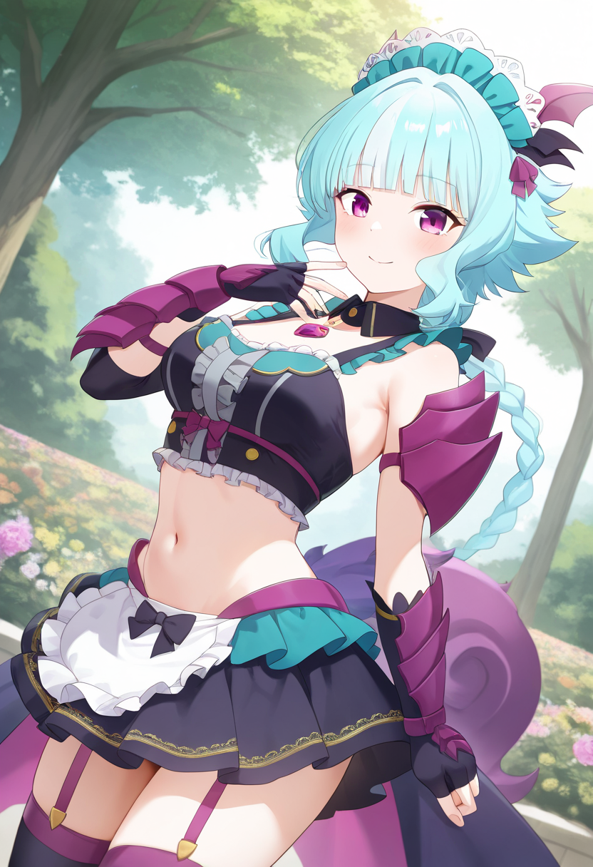 aqua hair,light blue hair,purple eyes,long hair,blunt bangs,multicolored hair,single braid,head wings,purple tail,headdress,