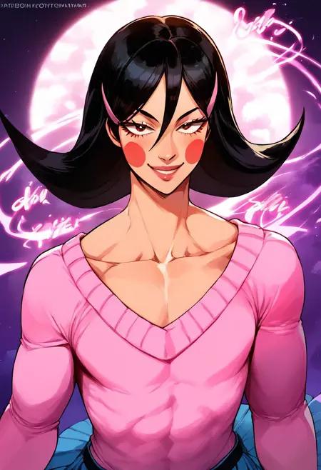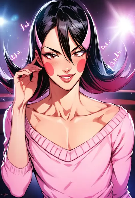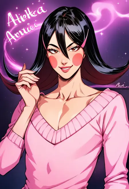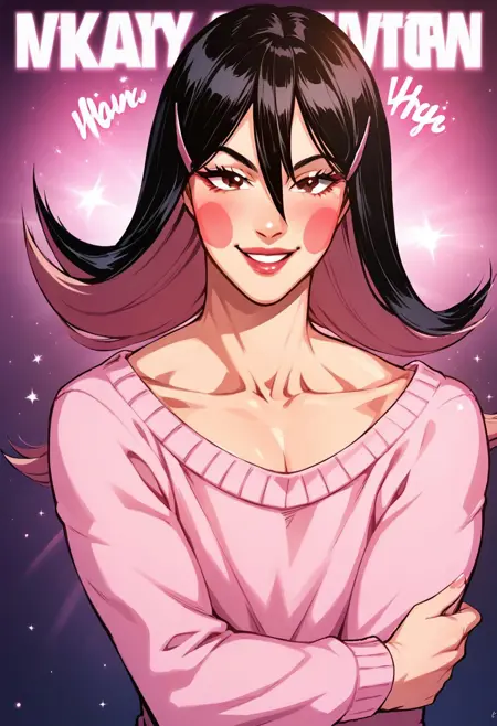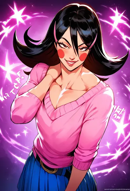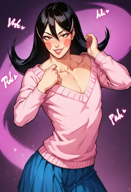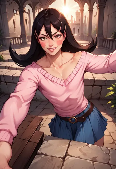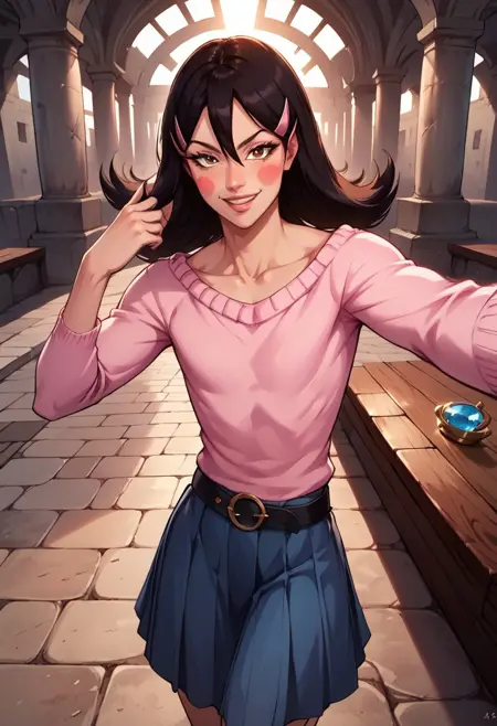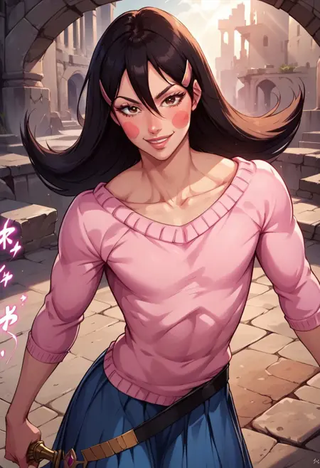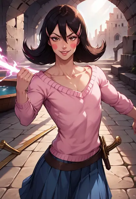 OkamaitachiOPM, 1소녀, 솔로, 남자아이, 검은 머리, 긴 머리, 눈 사이의 머리카락, 머리 장식, 머리핀, 갈색 눈, 입술, 블러시 스티커, 깔끔한 쇄골, 평평한 가슴, 핑크색 보트넥 스웨터, 긴 주름진 파란 치마, 벨트, 무기, 검, 가죽 스틸레토 앵클 부츠,