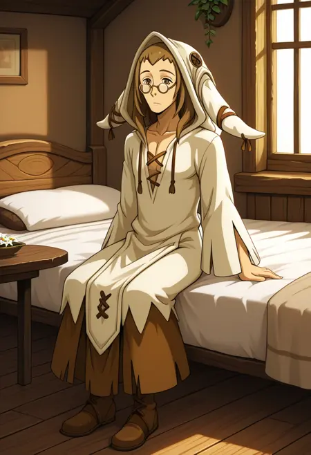 Qilby_good, glasses, brown eyes, brown hair, robe, hood, 1man, robe, pants, solo