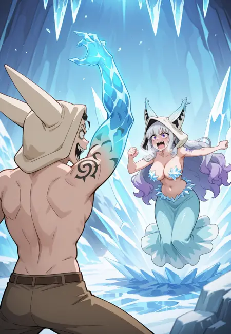 Qilby_crazy, animal ears hood, one glowing arm, 1man, sharp teeth, tattoo, topless male
