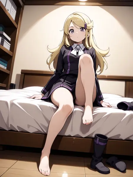 彼女の典型的な外見には、「acetrainer xy,hairclip,white ascot,black shirt,skirt,knee boots」を追加してください。