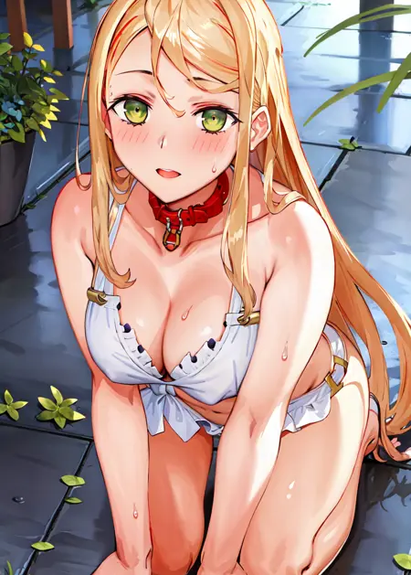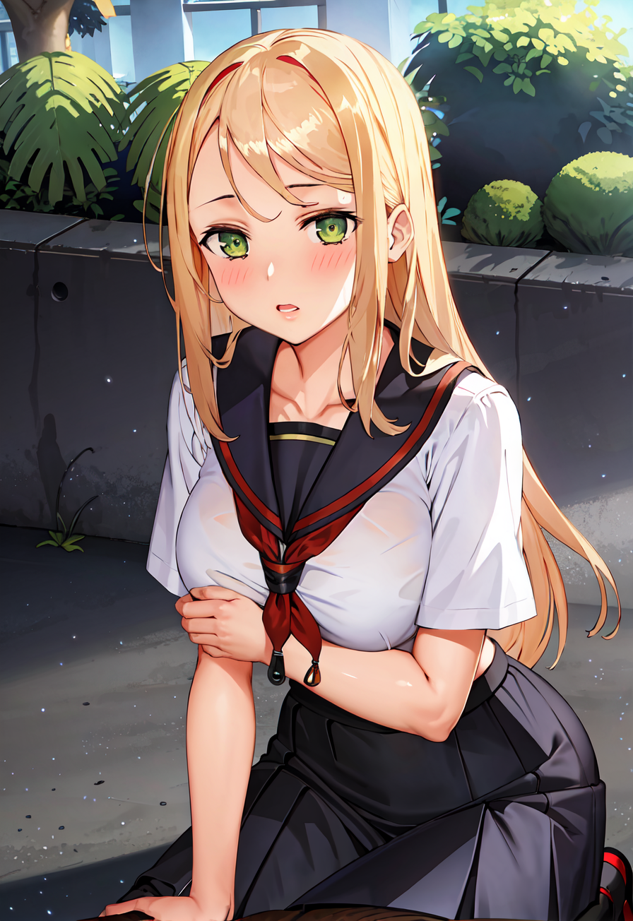블론드 헤어, 긴 머리, 스윕 앞머리, 녹색 눈,