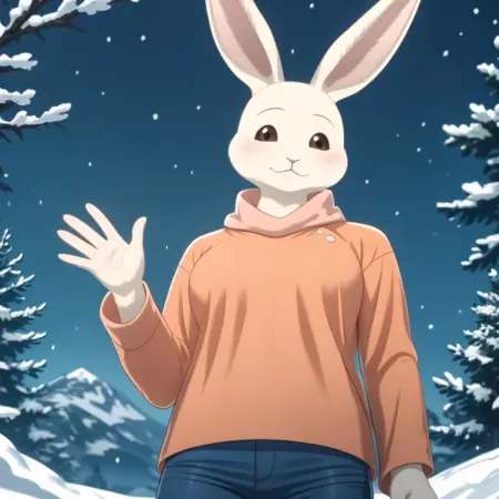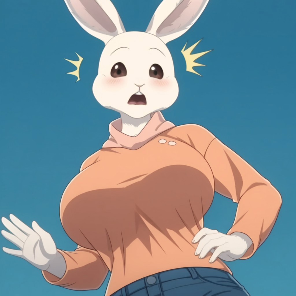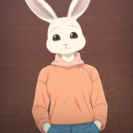 正面提示词:HaruS3,毛茸茸的,拟人化,兔形动物,雌性兔子,粉红色耳内侧,黑色眉毛,细眉毛,棕色眼白,黑色眼睛,闪亮的眼睛,白色身体,白色皮毛