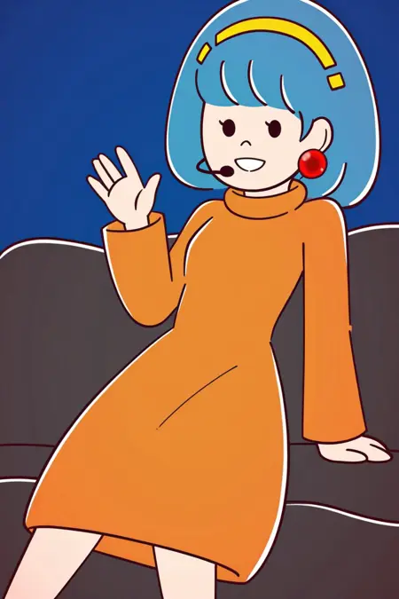 Helpful: 1girl, orange sweater dress, yellow headband, black eyes, red earrings, microphone headset,