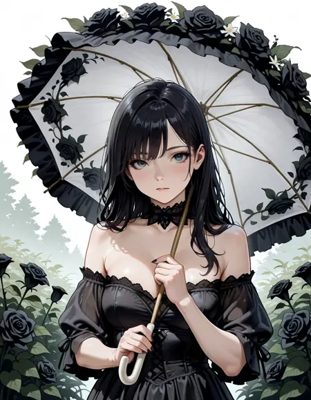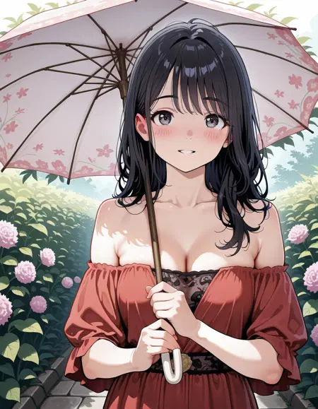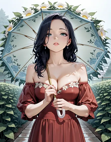 hud_gwn1i_illust, 드레스, 어깨 드러난, 꽃무늬 우산,