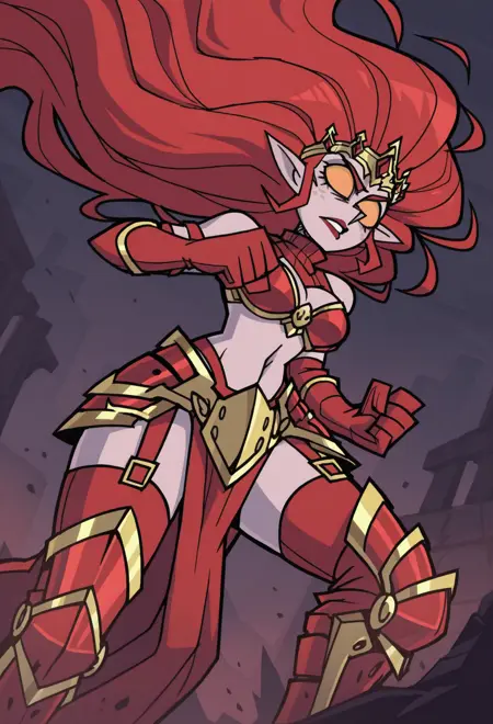 ss-h5BSis, 뾰족한 귀, 주황색 흰자개, 눈동자 없음, 립스틱, 메이크업, 붉은 머리, 매우 긴 머리, 큰 머리, 갑옷, 왕관, 비키니 갑옷, 빨간 터틀넥 비키니, 빨간 팔꿈치 장갑, 빨간 팔찌, 빨간 골반 커튼, 빨간 허벅지 스타킹,