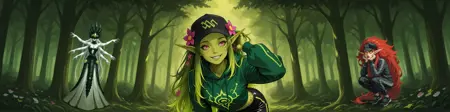 ss-h5BFury, 뾰족한 귀, 주황색 흰자개, 눈동자 없음, 립스틱, 메이크업, 붉은 머리, 매우 긴 머리, 큰 머리, 원형 머리장식, 귀걸이, 터틀넥 비키니 상의, 허리 노출, 팔 없음, 어깨 노출, 유두 아래 노출, 배꼽, 팔찌, 장갑, 골반 갑옷, 보라색 골반 커튼, 검은 허벅지 스타킹, 다리 갑옷,