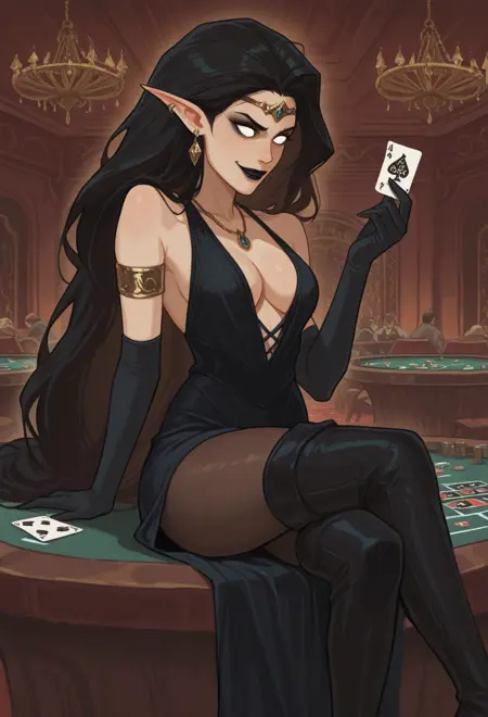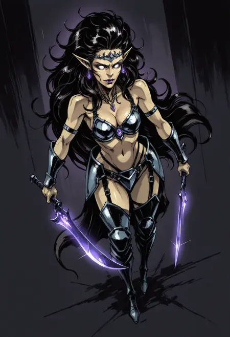 ss-h5BMaid, 뾰족한 귀, 흰자개, 눈동자 없음, 빈 눈, 배꼽, 립스틱, 메이크업, 검은 머리, 매우 긴 머리, 큰 머리, 원형 머리장식, 귀걸이, 목걸이, 갑옷, 비키니 갑옷, 어깨 노출, 가슴 노출, 팔찌, 갑옷으로 된 골반 커튼, 골반 갑옷,