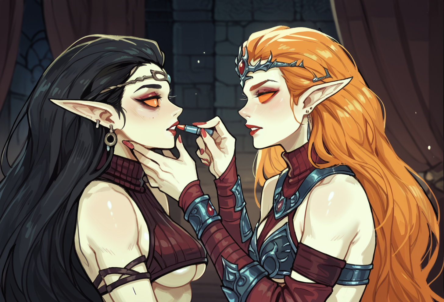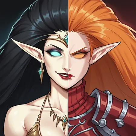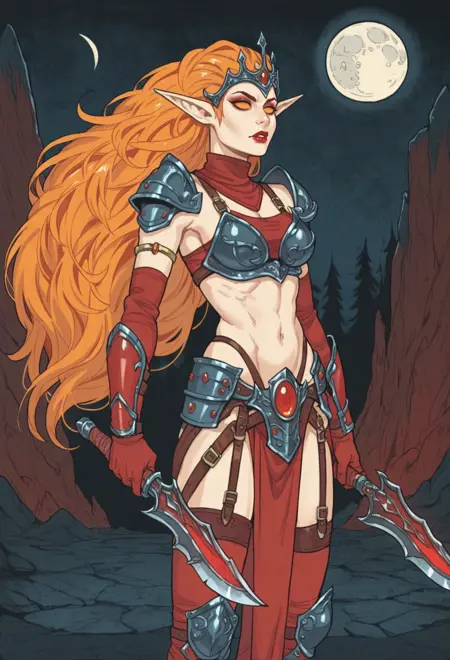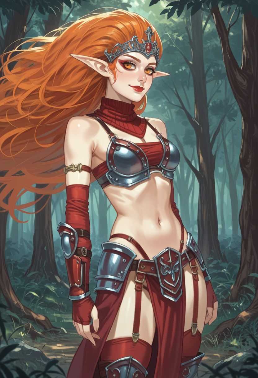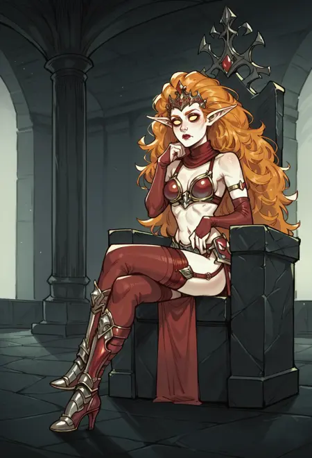 ss-h5BSis, 뾰족한 귀, 주황색 흰자개, 눈동자 없음, 립스틱, 메이크업, 붉은 머리, 매우 긴 머리, 큰 머리, 갑옷, 왕관, 비키니 갑옷, 빨간 터틀넥 비키니, 빨간 팔꿈치 장갑, 빨간 팔찌, 빨간 골반 커튼, 빨간 허벅지 스타킹,