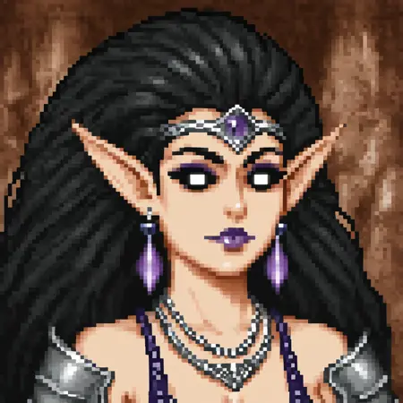 ss-h5BMaid, 뾰족한 귀, 흰자개, 눈동자 없음, 립스틱, 메이크업, 검은 머리, 매우 긴 머리, 큰 머리, 원형 머리장식, 귀걸이, 목걸이, 갑옷, 비키니 갑옷, 가슴 노출, 배꼽, 팔찌, 골반 갑옷,