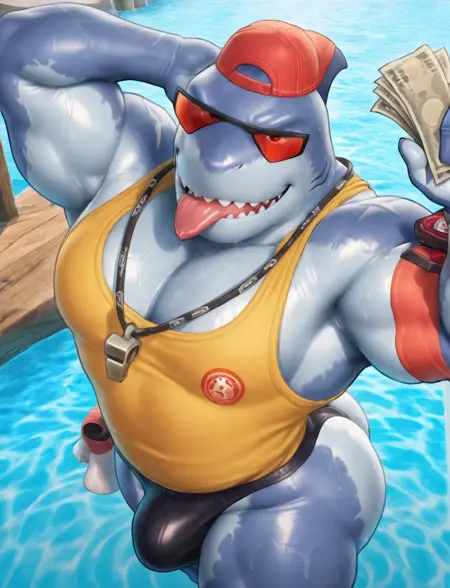 正面提示:steve_sf_(fortnite),成熟的兽人,肌肉发达的男性,鲨鱼,粗壮的大腿,发达的胸肌, bara 风格,黄色背心,橙色太阳镜,红色帽子,脖子上挂着哨子,臂带