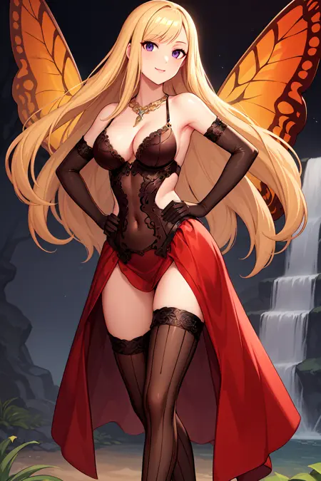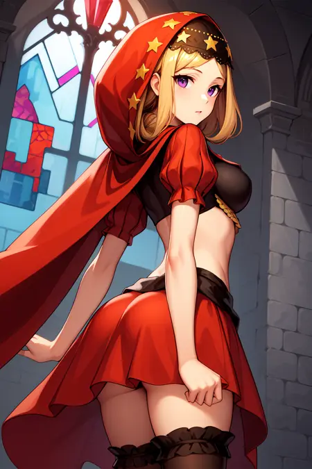 このキャラクターをプロンプトするには、「lora:Velvetv3:strengthベロニット、レッドフード、赤いふわふわのスリーブ付きブラッククロップトップ、星型ヘッドドレス、ウエストケープ、縦縞ストッキング、ハイヒール」と入力してください。