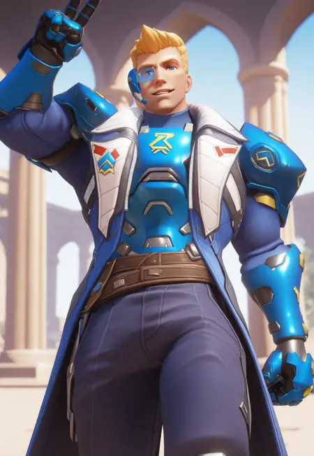 - 生成突击指挥官莫里森艺术 - 1boy, soldier: 76 \(strike commander morrison\) \(overwatch\), jackm, 短发, 金发, 蓝眼睛, 侧鬓, 前翘发, 通讯器, 蓝色胸甲, 护甲, 蓝色肩甲, 长袖, 蓝色护腕, 蓝色风衣, 长外套, 深蓝色长裤, 蓝色靴子