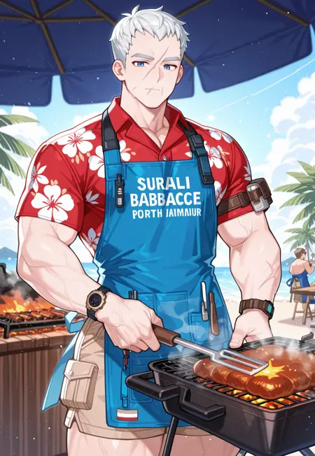 - 生成烧烤大师:76艺术 - 1boy, soldier: 76 \(overwatch 1\), classic76, 非常短的头发, 白发, 花苞头, 短刘海, 脸上疤痕, 夏威夷衬衫, 红色衬衫, 蓝色围裙, 棕色短裤, 袜子, 凉鞋, 紫色护目镜, 紫色墨镜, 官方替代服装