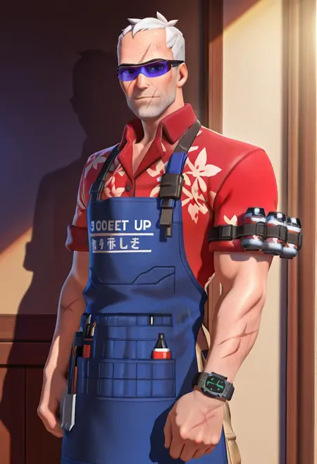 - Grillmaster: 76 のアートを生成する場合 — 1boy, soldier: 76 (overwatch 1), classic76, 非常に短い髪, 白髪, ピクシーカット, 短い前髪, 顔の傷跡, ハワイアンシャツ, 赤いシャツ, 青いエプロン, 茶色の短パン, ソックス, サンダル, 紫色のゴーグル, 紫色のサングラス, 公式アラーネイトアウトフィット