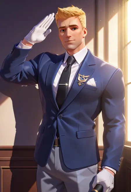 - 彼の Class President: 76 アウトフィットを生成する場合 — soldier: 76 (class president: 76) (overwatch), 短い髪, ブロンド髪, 青い目, 眼鏡, 青いジャケット, 赤いネクタイ, 白いシャツ, 黒パンツ, 茶色のローファー