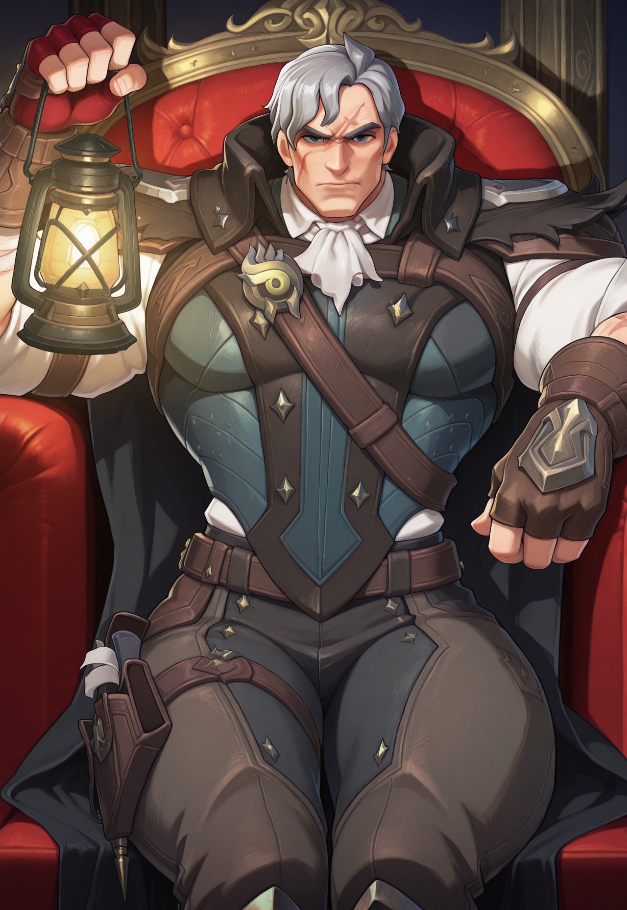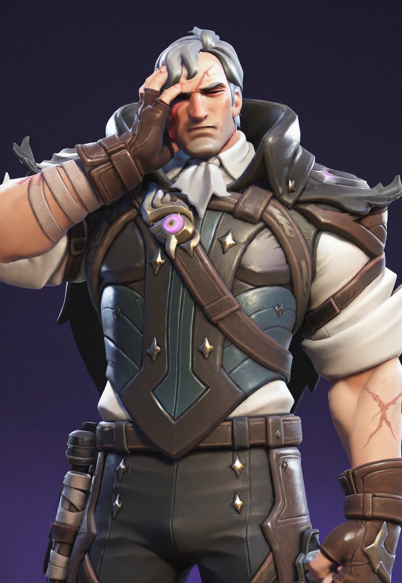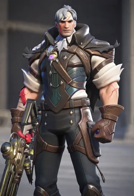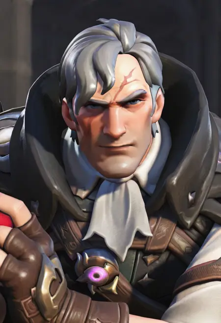 - 그의 Survivor: 76 복장 생성 - soldier: 76 (survivor: 76) (overwatch), 짧은 머리, 회색 머리, 파란 눈, 얼굴 흉터, 입 흉터, 흰 아스콧, 흰 셔츠, 조끼, 망토, 갈색 장갑, 손가락 없는 장갑, 바지, 부츠