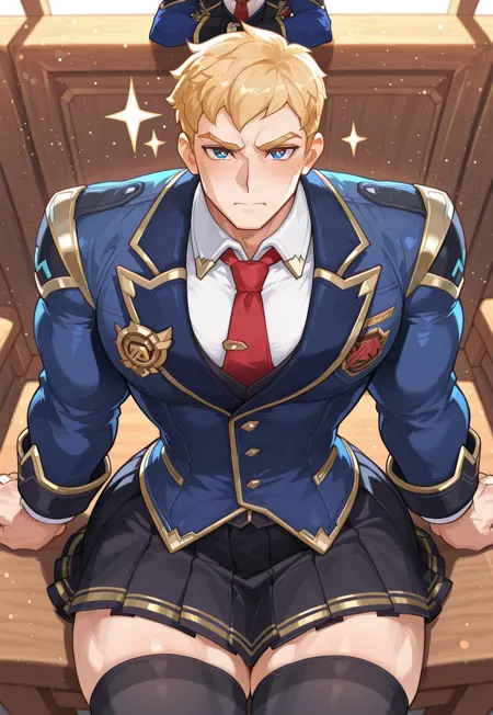 - 彼の Class President: 76 アウトフィットを生成する場合 — soldier: 76 (class president: 76) (overwatch), 短い髪, ブロンド髪, 青い目, 眼鏡, 青いジャケット, 赤いネクタイ, 白いシャツ, 黒パンツ, 茶色のローファー