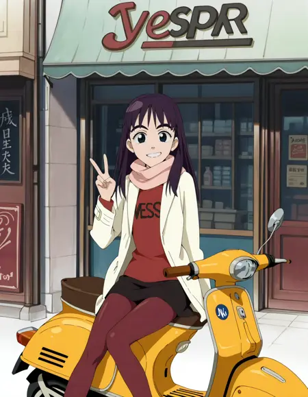 니나모리, 긴 머리, 스카프, 빨간 셔츠, 코트, 미니스커트, 검은 치마, 빨간 팬티스타킹